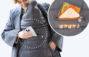 背面には、スマートフォンや小物を入れられるファスナー付きポケット(ハグポケ)を搭載。カイロを入れておけば、あたたかさもアップ。さらに、ママの手を温めるあったかポケットも裏地はポーラーフリースで、冷えがちな手先を優しく包みます。