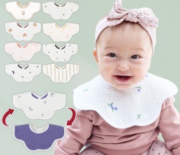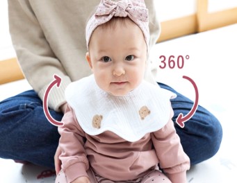 popomiのスタイは、360度使える円形デザイン。よだれで濡れても、乾いた面をくるっと前に回せるので、細かい着替えの手間が減ります。また、裏表で使えるリバーシブル仕様で、柄と無地をコーディネートに合わせて楽しめるのも人気のポイントです。