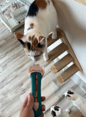 食べ物を手にした瞬間、猫たちの表情と食いつきが一変^_^